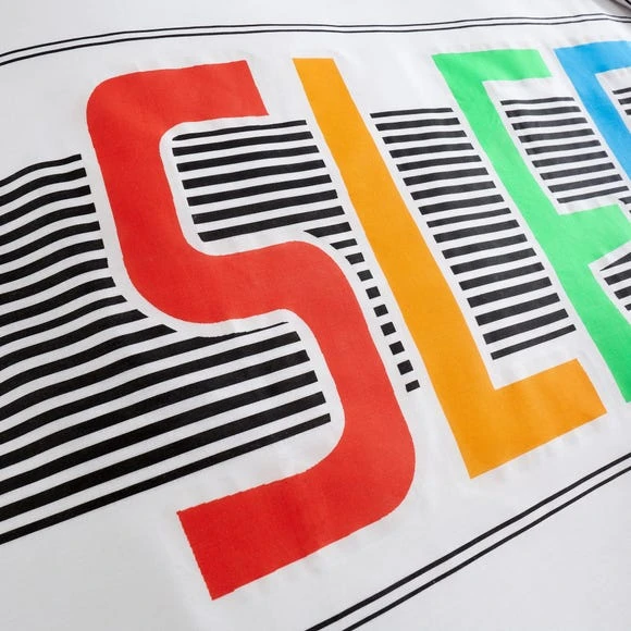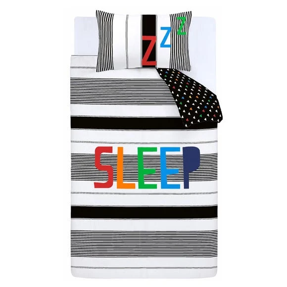 Sleep in comfort with this fun bold sleep text design layered on top of an array of stripes. With the additional glow in the dark outline around the sleep and zzz, this duvet set adds both fun and comfort whilst also being a soothing night light to help drift off to sleep. Catherine Lansfield is renowned for style and quality – designed and developed in Great Britain.