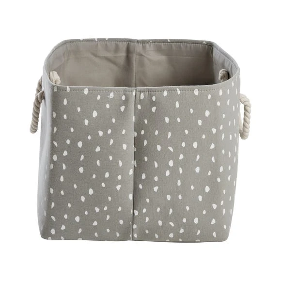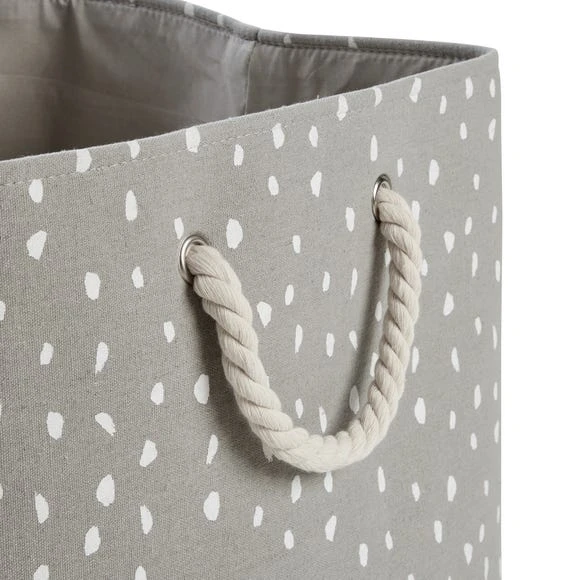 Organise your little ones room with our Dotty Storage Basket Grey, perfect for keeping bits and bobs neat and tidy, this storage basket with a cute dot print and modern colourway will complement an array of home decors. With a space saving design, this storage basket can be neatly folded away when not in use. This piece also has a rope handle for ease of use, making it both a practical and attractive piece to have in your home.