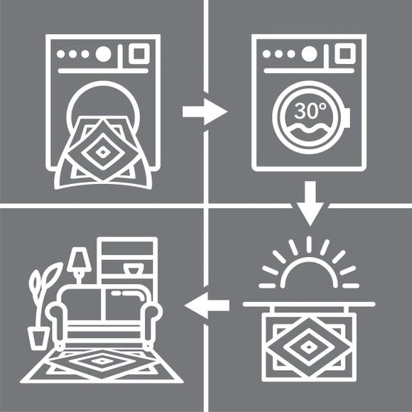 This is a hand-made flatweave rug. When opening, re-roll your rug pile out and leave in a warm room for 24 hours before putting in place, this will help to reduce wrinkles and curling from packing. Turn your rug regularly to ensure even wear and reduce pressure marks from furniture. Do not pull any loose threads, please cut them carefully with scissors to remove. Avoid prolonged exposure to direct sunlight as this may cause fading of the colour. A small amount of fibre loss is normal on a new rug. Before using any cleaning products on your rug, test on an inconspicuous area first to ensure it does not affect the colour. Clean spills immediately by blotting with a clean dry white cloth – do not rub as this may stain the fibres. Vacuum your rug regularly to remove everyday dirt, we recommend the use of a suction type vacuum cleaner as a rotating vacuum brush can cause damage to the pile surface. We recommend the use of an anti-slip mat beneath your rug to prevent it from slipping and sliding out of place. Please do not leave babies or young children unsupervised on this rug.