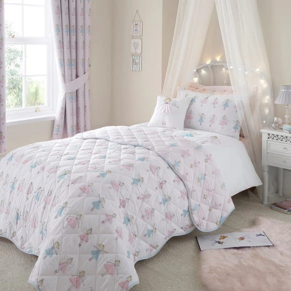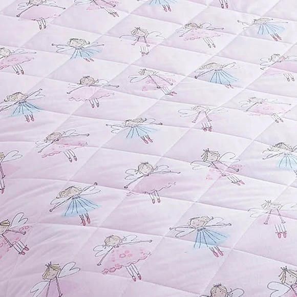 Decorated with a reversible fairy pattern on a lilac background, this machine washable bedspread is crafted from a blend of cotton and polyester for softness and durability and is finished with blue piped detail.
