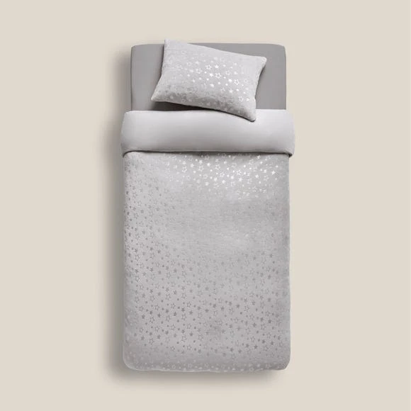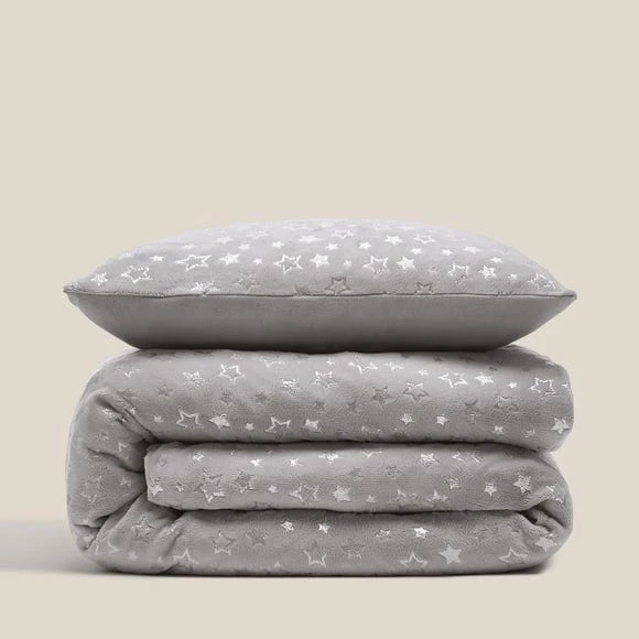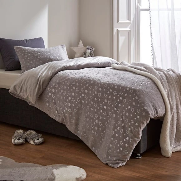 Dunelm Grey Foil Stars Fleece Duvet Cover and Pillowcase Set Polyester, Super Soft Teddy, Duvet Cover Sets