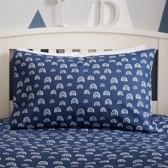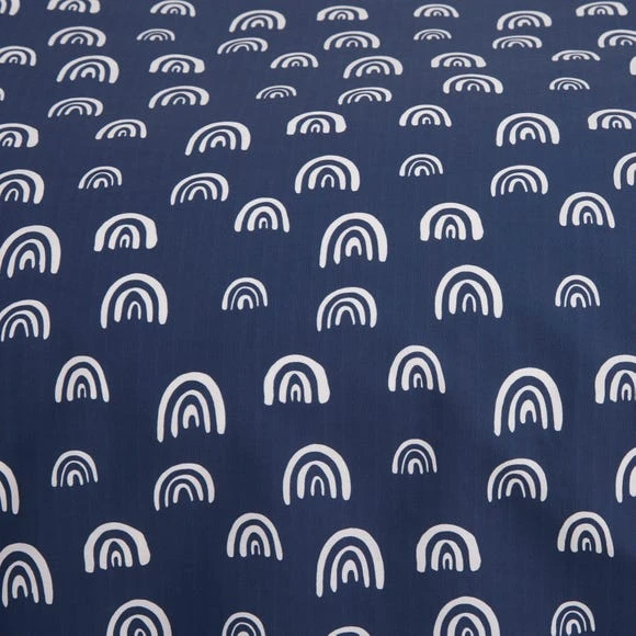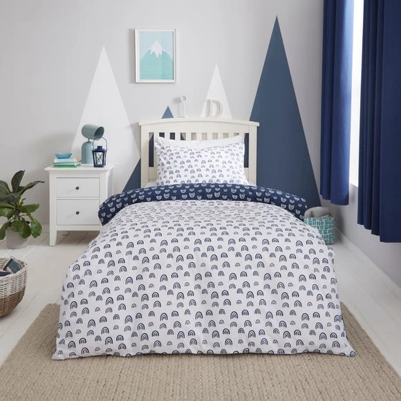 A stylish navy rainbow design has been printed onto this fun children’s duvet cover set. The front has white rainbows printed onto a white background while the reverse features a contrasting alternative colourway. A polycotton composition allows the duvet cover and pillowcase set to be easily cared for and fully machine washed. Choose from single and double.