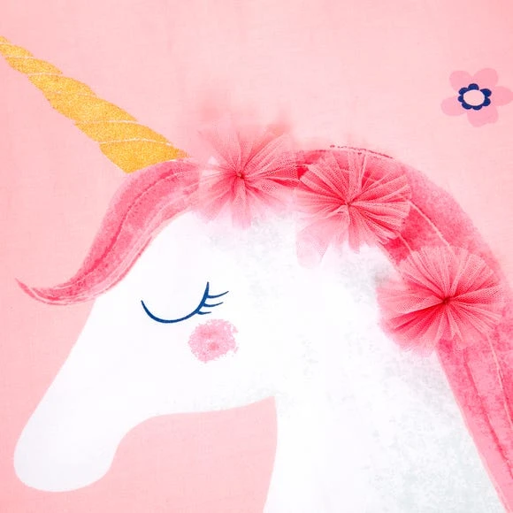 Featuring a pink unicorn design and cute flower embellishment, this duvet cover set includes a pillowcase and is finished with a button hem opening. Machine washable for easy care and has matching items available.