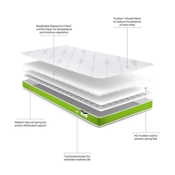 Complete with breathable rebound e-Fibre™ comfort layer to help regulate the temperature and allow a constant flow of air, this mattress is finished with edge-to-edge layers of comfort, reducing the chances of the mattress sinking or bulging.