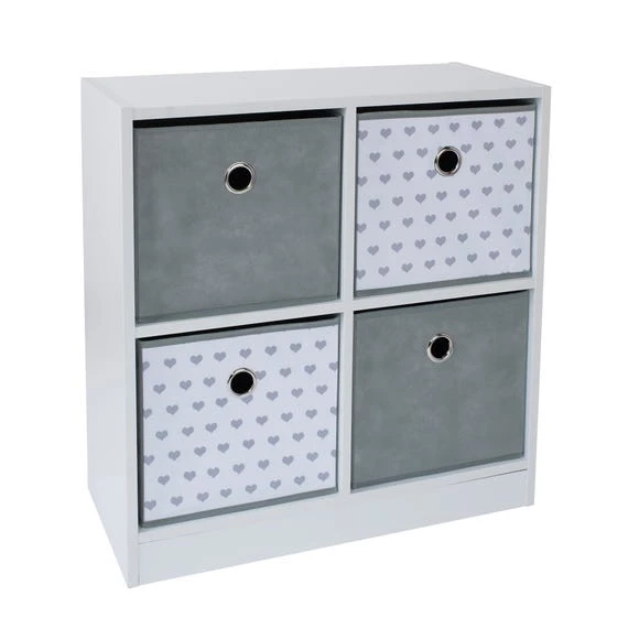 This beautiful 4 Cubes Storage Unit, boasting a printed grey heart pattern and including and 4 grey drawers is perfect storage for children’s toys and books. Easy to assemble this stylish storage unit is ideal for playrooms and kids bedrooms, and its grey and white colourways mean it would compliment any interior.